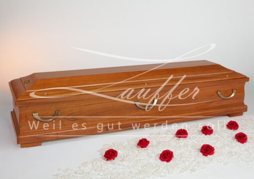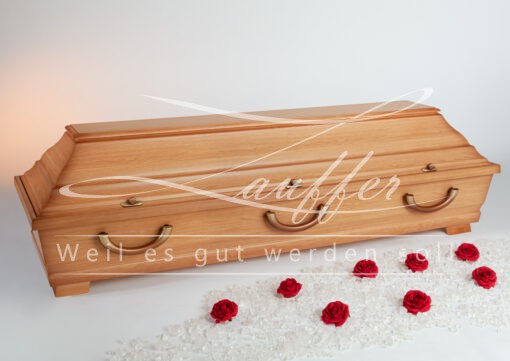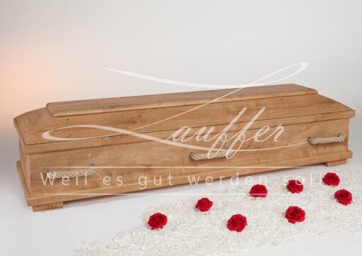 Moderner Kiefernsarg mit Ahorndekor in Antik mit Karnieskehlung sowie einem einfach abgesetzten Deckbrett