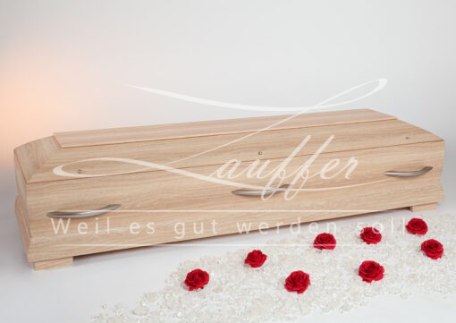 Moderner Kiefernsarg mit Steineichedekor in Natur mit Karnieskehlung sowie einem einfach abgesetzten Deckbrett