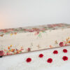 Moderner Kiefernsarg mit natürlicher Maserung gebürstet und Weiß lackiert. Das Bluemstraußmotiv wird auf die Truhe gedruckt.