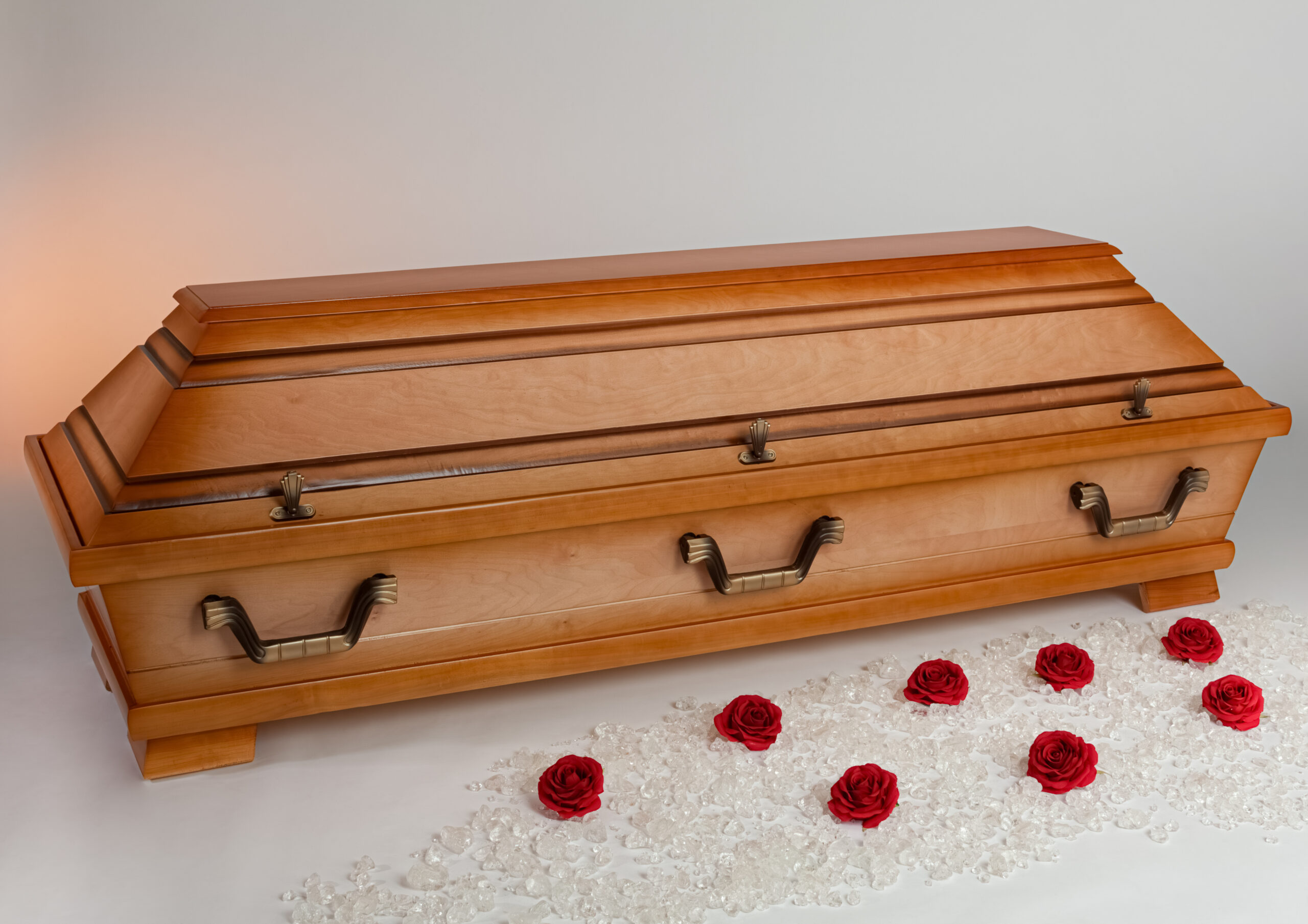 Klassischer Pappelsarg Altdeutsch patiniert Hell mit 4-Fach Kehlung sowie einem einfachen Deckbrett