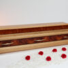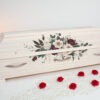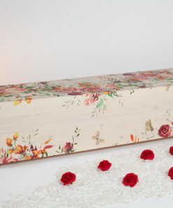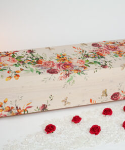 Vollholztruhe mit natürlicher Maserung gebürstet und Weiß lackiert in einer konischen Form, das Motiv „Rosengarten“ wird auf die Truhe gedruckt